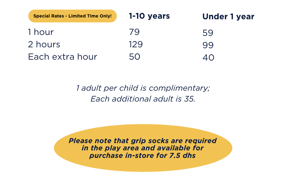 Supervision by a parent or caregiver is required at all times. Prices are listed in AED and include 5% VAT.